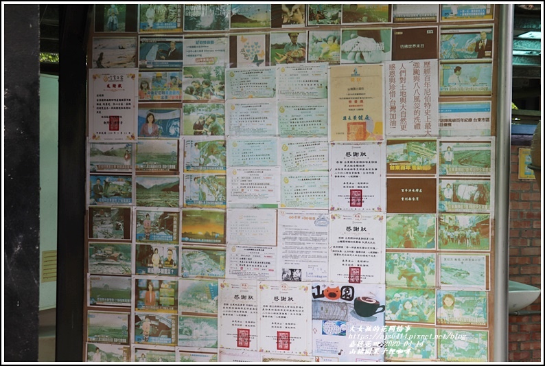 貼著密密麻麻的感謝狀及山豬園的人文歷史記念照