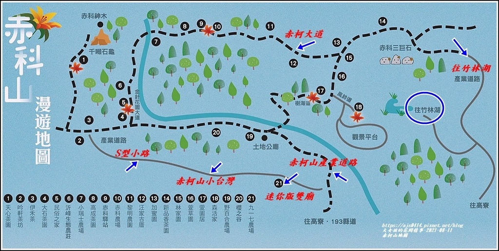 沿著上去會在吟軒茶坊進入赤柯山金針花園區的主道路(如上地型圖)