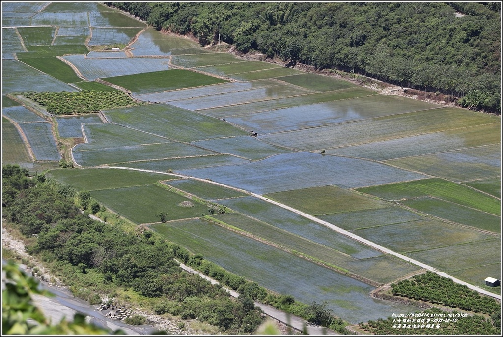 觀景台正下,蜿蜒大川擁抱著大片稻田