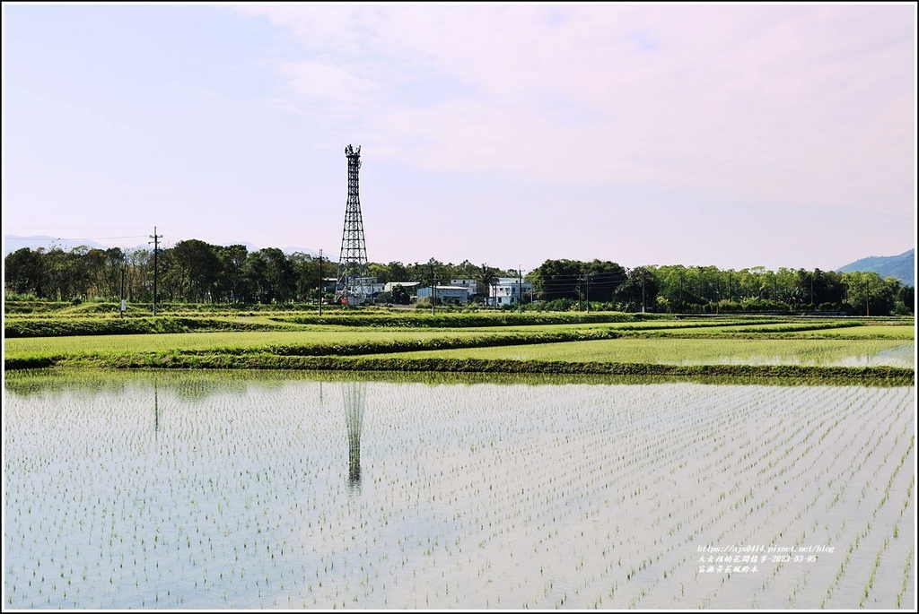 遠方應該是基地台,影子倒映在水田間,竟也出奇的美