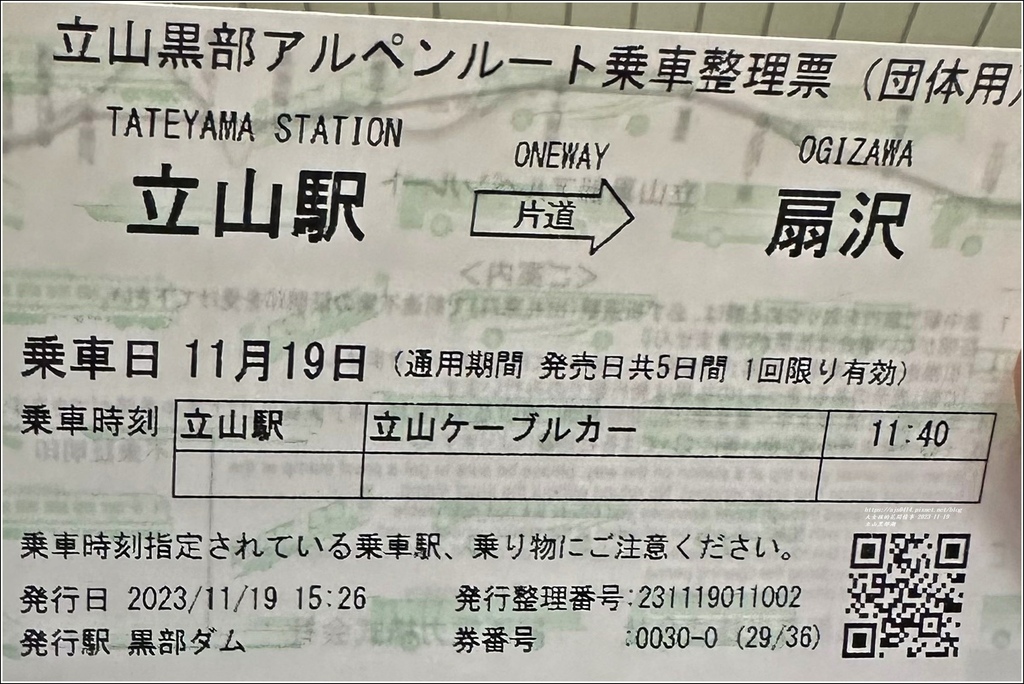 乘車日:2023年11月19日:乘車時刻:立山站11點40分