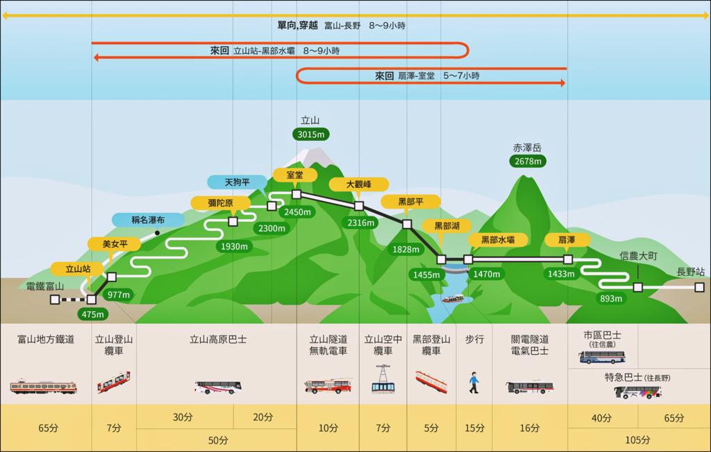 立山隧道無軌電車、立山空中纜車、黑部登山纜車、關電隧道電氣巴士
