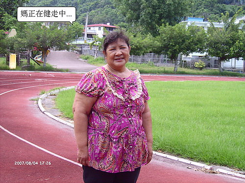 都會先在附近操場跑十圍走二圍,回到家後,又陪媽到村內國小健走,家裡大小孩子都帶著去運動,