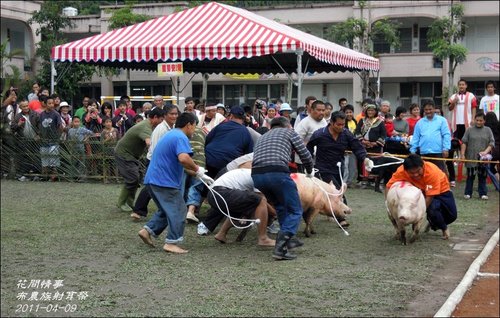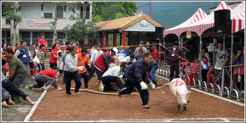 豬隻不受限..滿場跑..就見人追豬..豬躲人的畫面