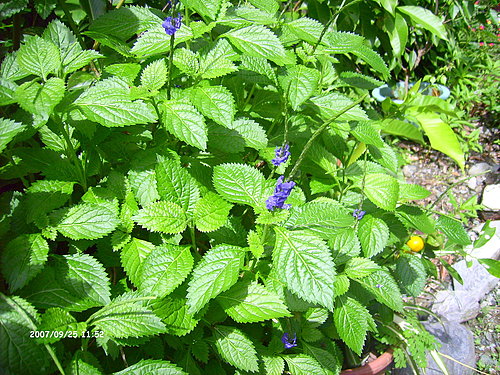 好像是香草植物的一種,開著一串藍色的小花,也很漂亮,葉子帶有一點馨香。