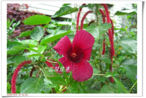 紫葵背後長長的毛毛蟲是紅穗鐵莧(貓尾花)