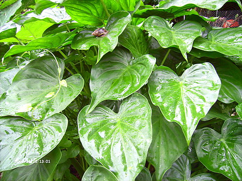 底圖六:佛手芋,常拿來做組合盆栽,葉型很討喜,這個在家旁空地自己長出來的,